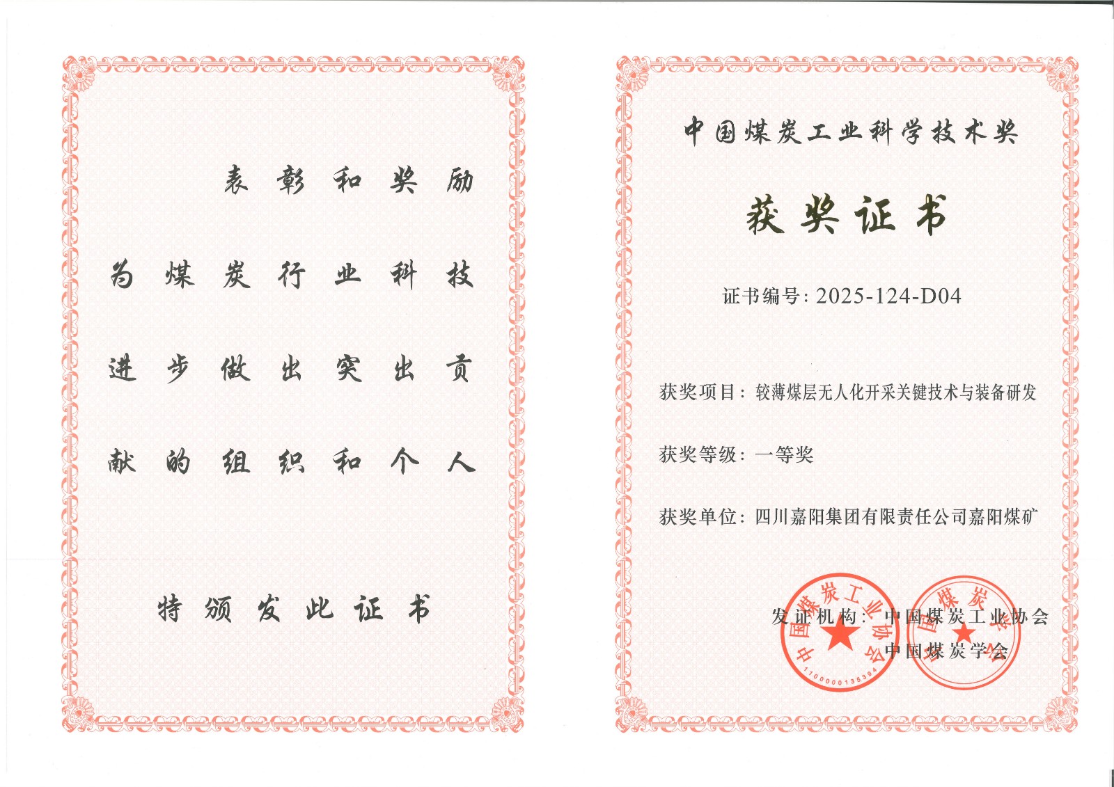 近日,2025年度中國煤炭工業(yè)協(xié)會科學技術(shù)獎獲獎結(jié)果揭曉,其中,四川嘉陽集團有限責任公司嘉陽煤礦的“較薄煤層無人化開采關(guān)鍵技術(shù)與裝備研發(fā)”項目,憑借出色的技術(shù)創(chuàng)新與應用成效榮獲一等獎。