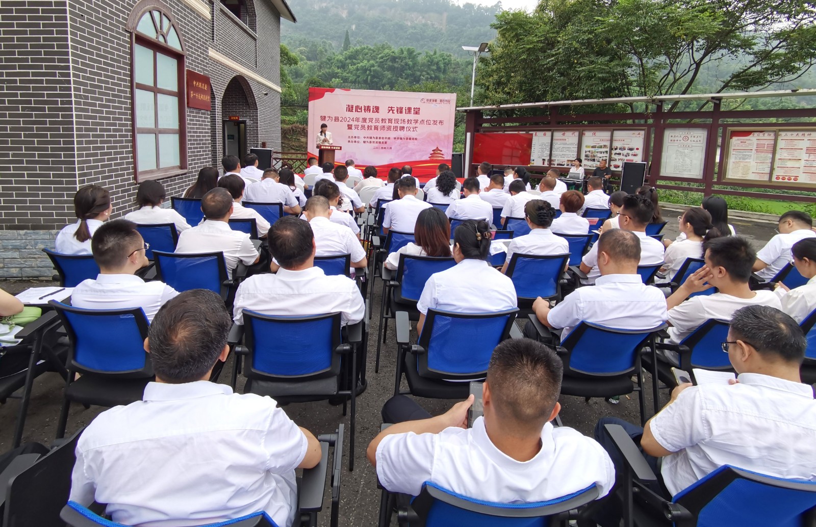 本次儀式由中共犍為縣委組織部、中共犍為縣黨校主辦,縣級相關(guān)部門和各鄉(xiāng)鎮(zhèn)代表70多人參加??h委常委、組織部部長羅卉要求各級黨組織重視黨員教育,借授牌儀式契機,加快現(xiàn)場教學(xué)點建設(shè),組織黨員到現(xiàn)場教學(xué)點開展活動;加快師資隊伍建設(shè),提高現(xiàn)場教學(xué)質(zhì)量,今年國慶節(jié)前全縣將開展現(xiàn)場教學(xué)演講比賽活動。