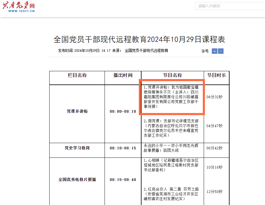 10月29日,由中共中央組織部主管、中央組織部黨員教育中心主辦的共產(chǎn)黨員網(wǎng)公布全國(guó)黨員干部現(xiàn)代遠(yuǎn)程教育課程表,集團(tuán)公司微堂課《我為祖國(guó)獻(xiàn)寶藏 燃燒精神永不滅》精彩亮相,用6分32秒的時(shí)長(zhǎng)為全國(guó)的黨員們呈現(xiàn)了難忘的一課。